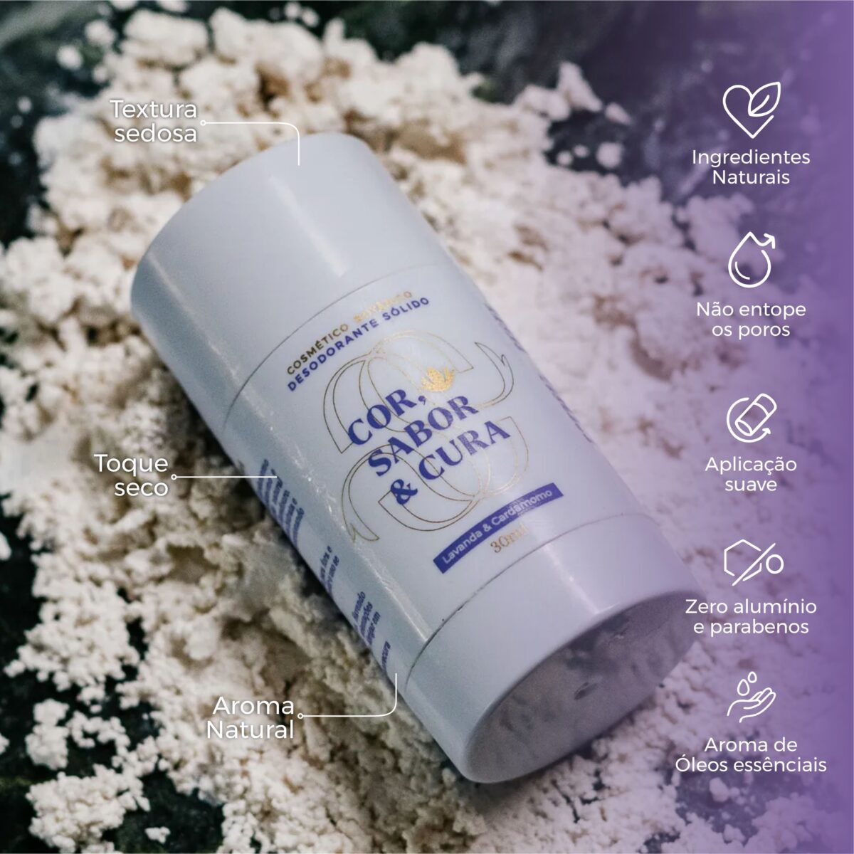 O desodorante Sólido Lavanda e Cardamomo oferece proteção natural, eficiência no combate ao mal cheiro, além de hidratação profunda e axilas mais uniformes.
