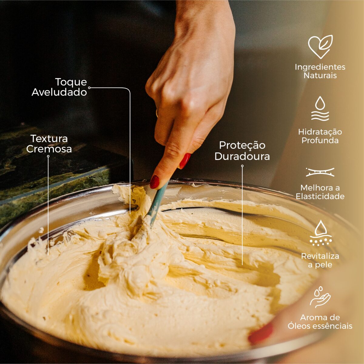 Com uma combinação rica de manteigas vegetais, óleos puros e óleos essenciais terapêuticos, a Manteiga Corporal Cor, Sabor e Cura foi desenvolvida para cuidar da pele de forma completa — promovendo nutrição, regeneração e bem-estar sensorial.